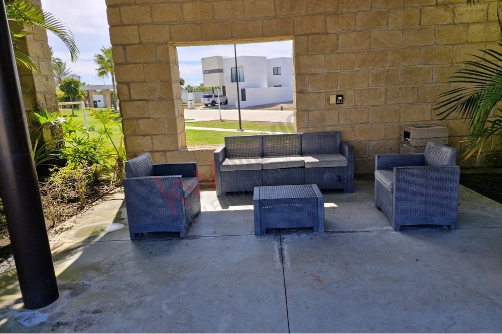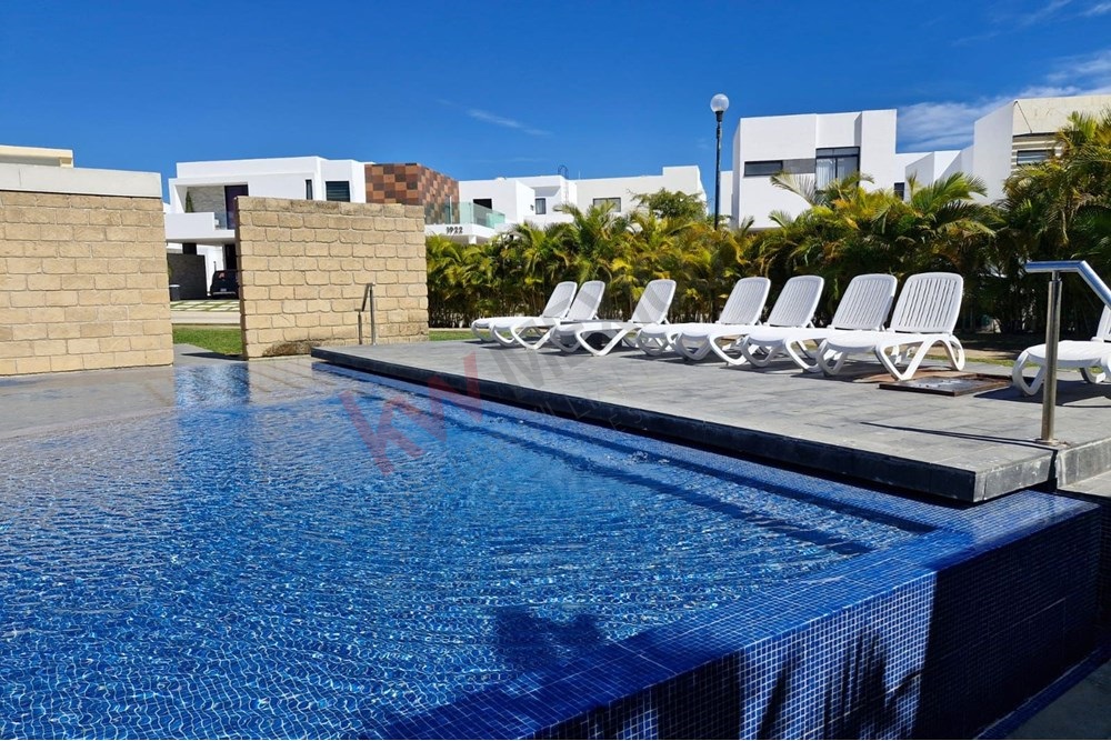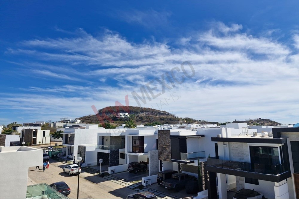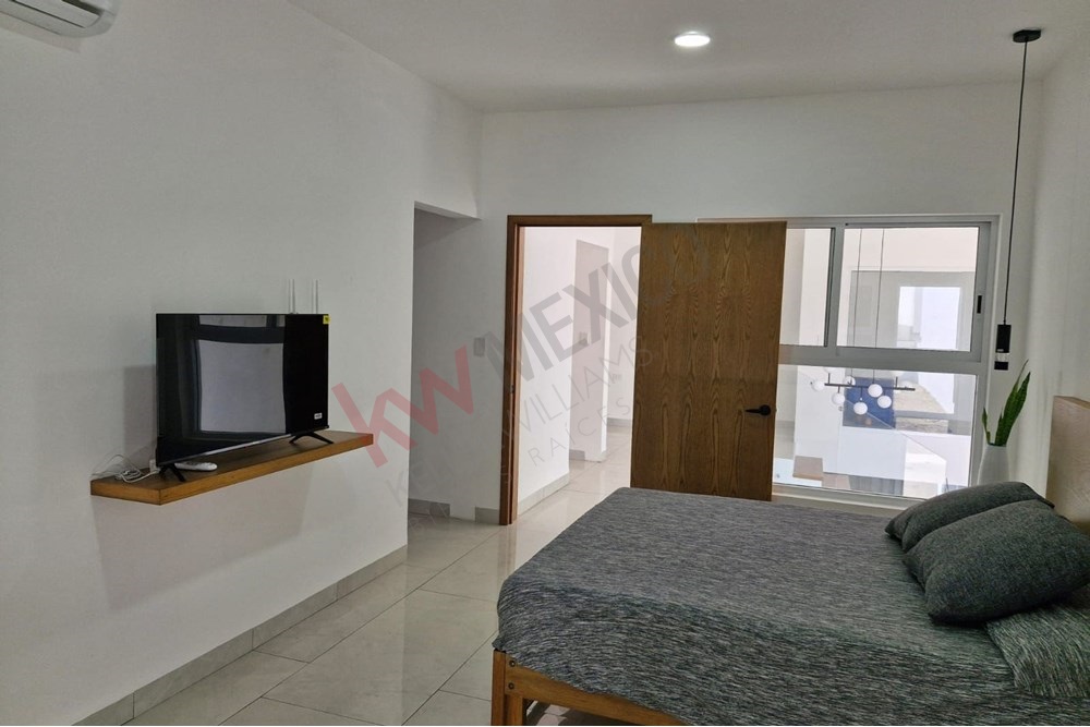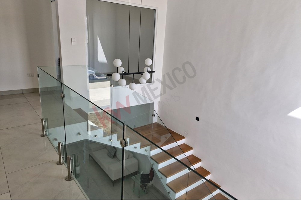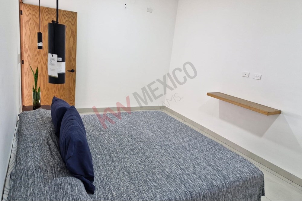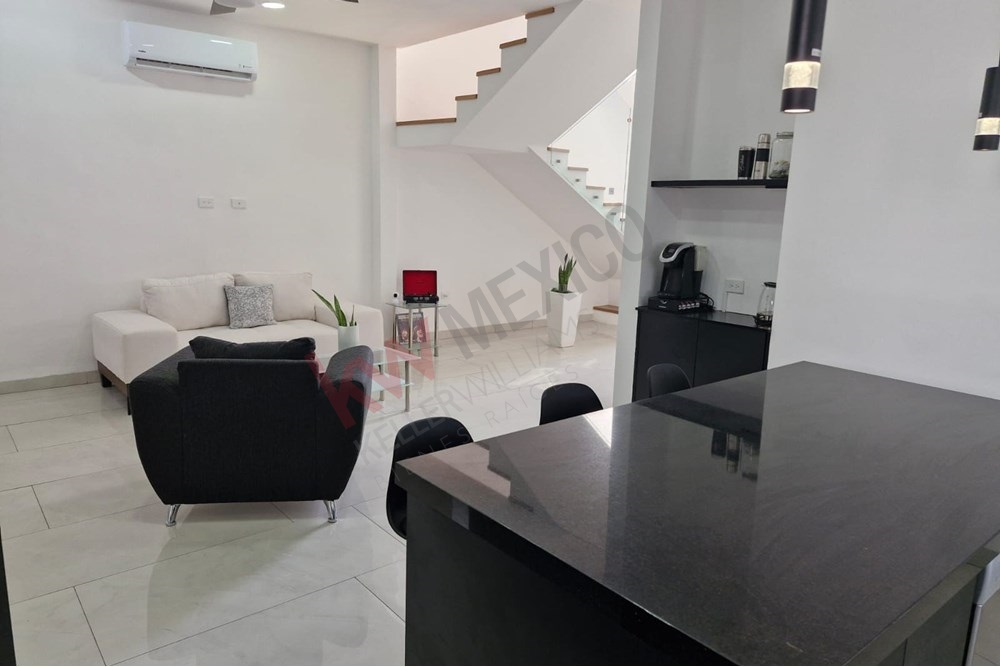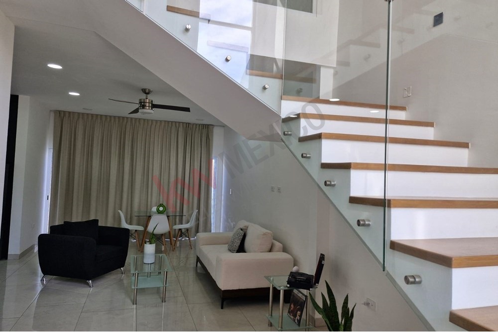 Exclusiva zona en Cerritos Completamente amueblada y equipada. Climatizada. 236 m2 de construcción. Distribución: Planta Baja: Cochera para dos autos. 1 Recámara. 1 Baño completo. Sala-comedor. Amplia cocina integral equipada. Equipamiento especial: Refrigerador para vinos, freidora de aire, lava vajillas, parrilla eléctrica, horno de gas, horno microondas, cafetera para café de cápsula, refrigerador de dos puertas con dispensador de agua. Patio. Planta Alta: 2 Recámaras con walking closet y baño completo (recámara principal con tina de baño). Medio baño. 1 espacio para gimnasio o estudio. Preparación para terraza. Amenidades: Alberca Casa
