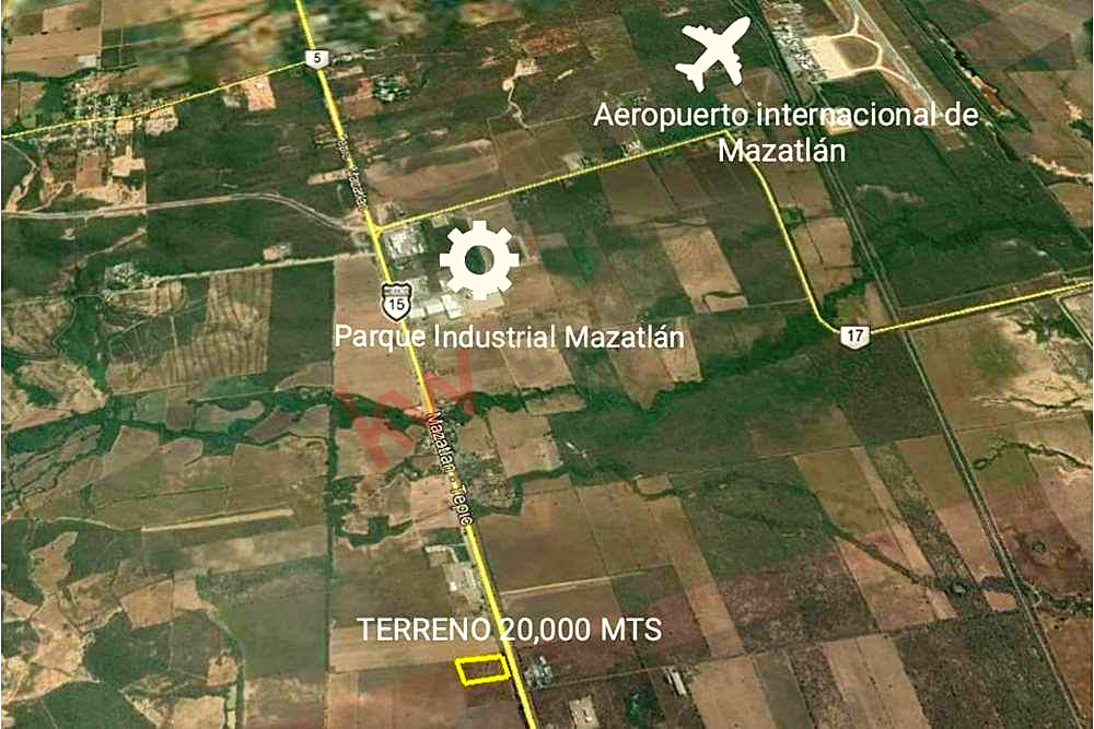 Terreno a pié de carretera Internacional México 15. PolÃgono con 100 m frente a Carretera Int. y 200 m de fondo.Ubicación privilegiada, a unos minutos del Aeropuerto Internacional de Mazatlán, Sugar Foods, Inovación AgrÃcola, Sello Rojo. entre otros..