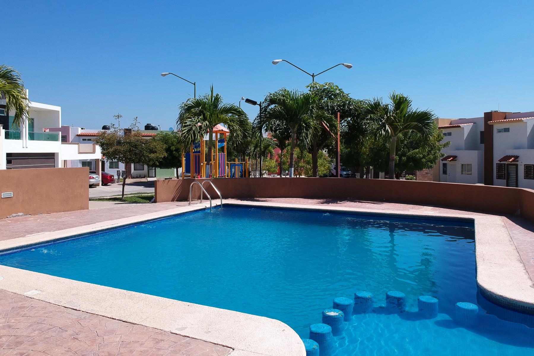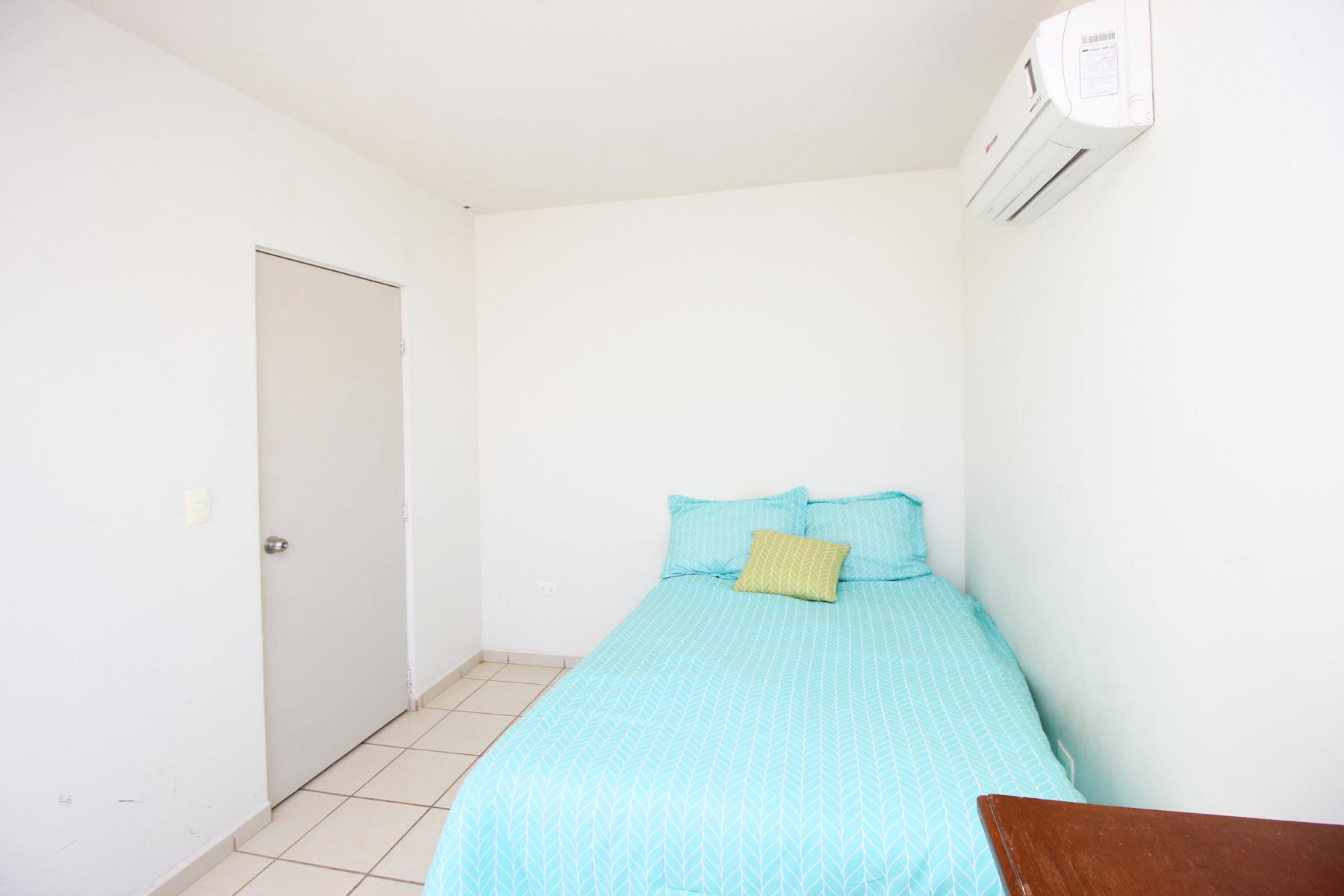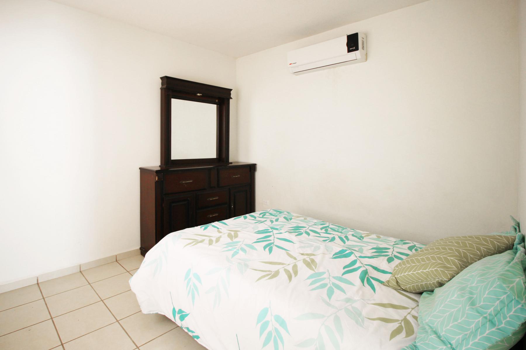 En planta baja cuenta con sala, comedor, cocina, una recamara y un baño completo, un amplio patio y entrada para cochera. En planta alta cuenta con dos recamaras y un baño completo. La casa se vende semi amueblada y equipada con protecciones y minisplits.