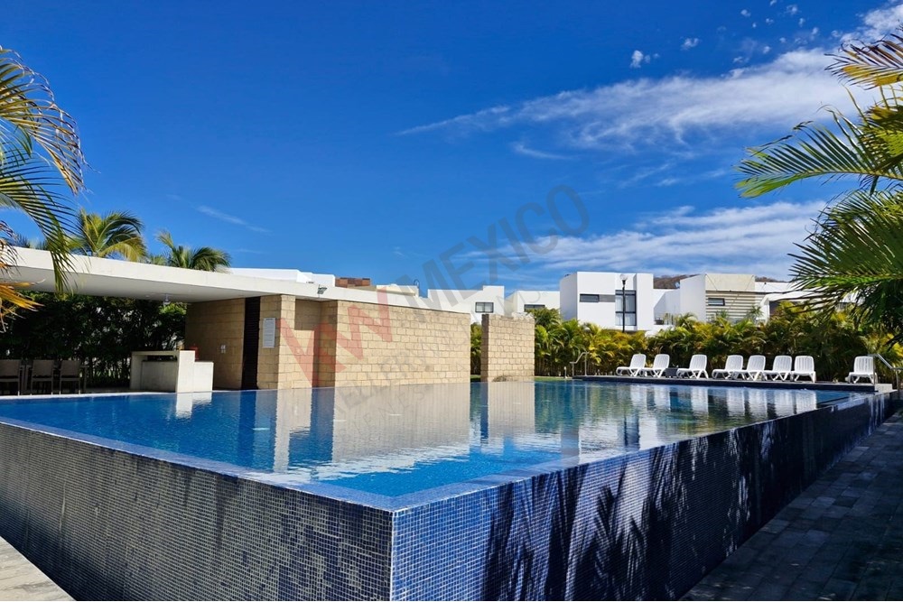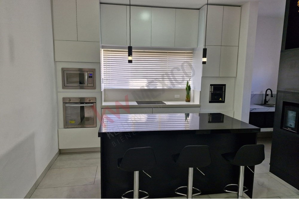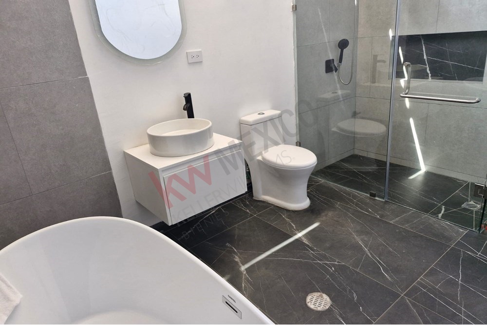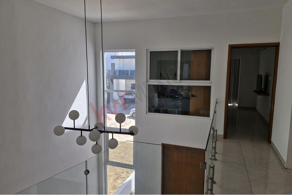 Exclusiva zona en Cerritos Completamente amueblada y equipada. Climatizada. 236 m2 de construcción. Distribución: Planta Baja: Cochera para dos autos. 1 Recámara. 1 Baño completo. Sala-comedor. Amplia cocina integral equipada. Equipamiento especial: Refrigerador para vinos, freidora de aire, lava vajillas, parrilla eléctrica, horno de gas, horno microondas, cafetera para café de cápsula, refrigerador de dos puertas con dispensador de agua. Patio. Planta Alta: 2 Recámaras con walking closet y baño completo (recámara principal con tina de baño). Medio baño. 1 espacio para gimnasio o estudio. Preparación para terraza. Amenidades: Alberca Casa