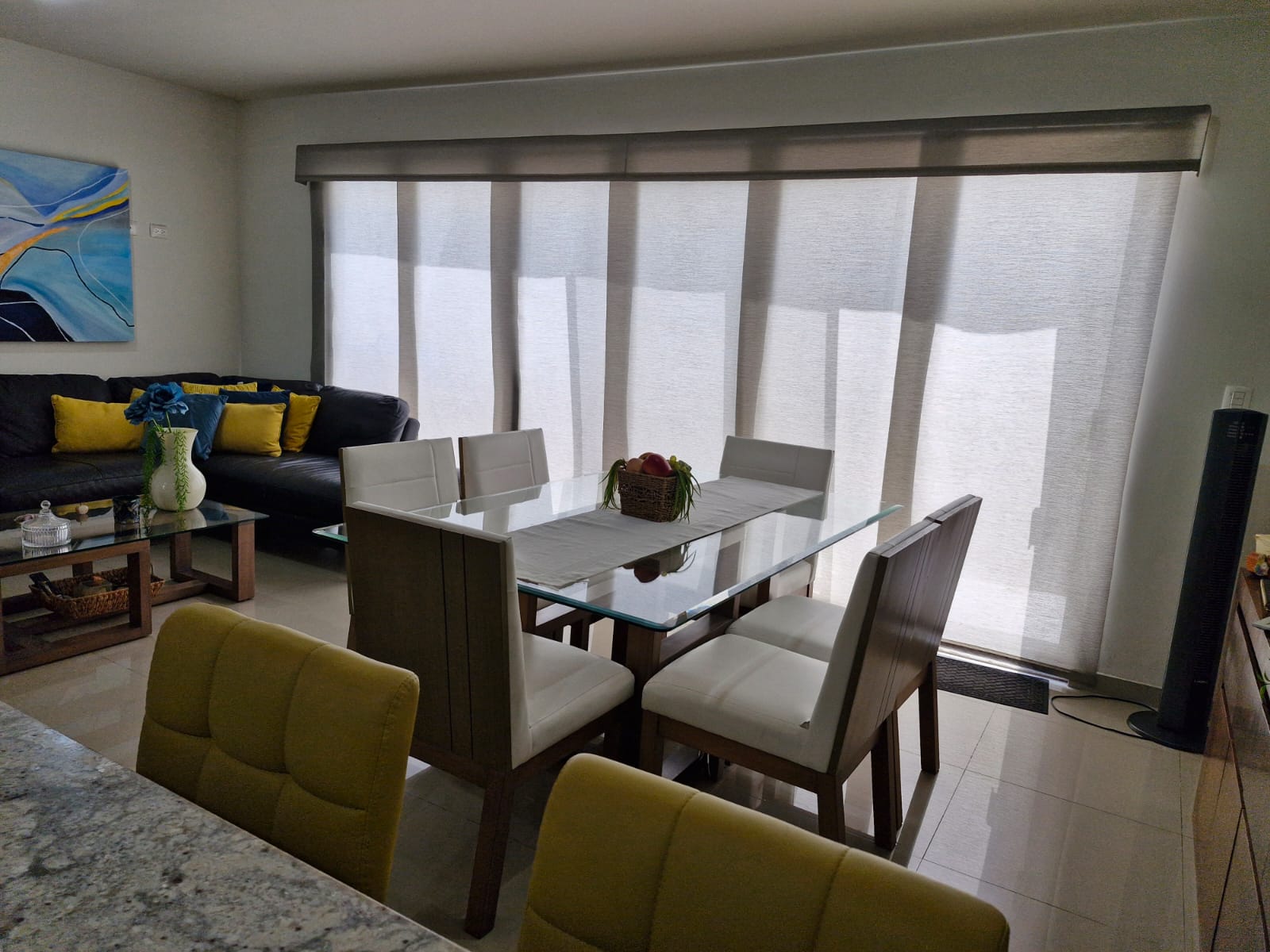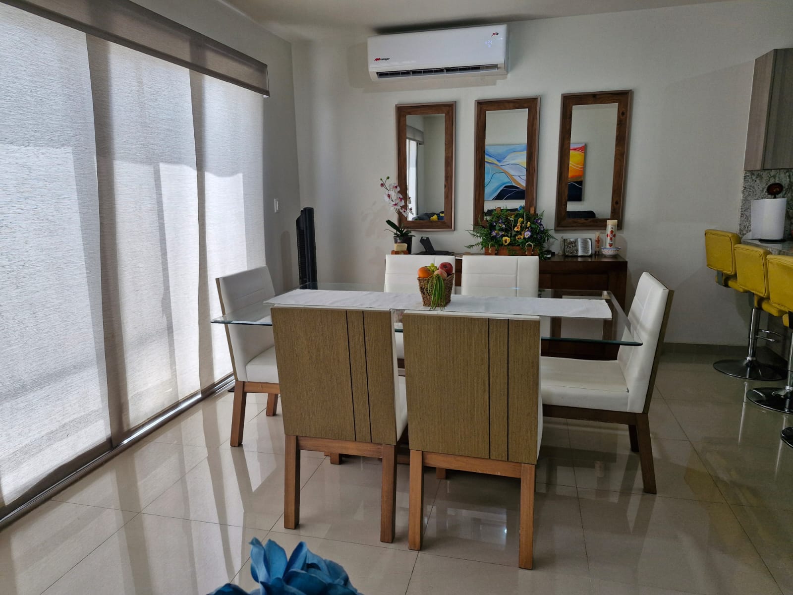 Planta Baja: ✅ Cochera Techada para 2 Autos ✅Cocina y barra desaynador ?️con cubierta de granito ✅Parrilla ✅Amplia Sala Comedor ✅1/2 Baño ✅ Cuarto de Lavado ✅Patio Planta Alta: ✅ 3 Recámaras ✅Recamara principal con ?️baño, Walking Closet, balcon y minisplit❄️ ✅Recamaras secundarias con closed abanico de techo y mini split ❄️ ✅1 Baño Completo ✅Pequeña sala de t.v ? con mini split❄️ Amenidades: ✅Coto Privado ✅Seguridad 24/7 ✅Areas Verdes ✅Alberca