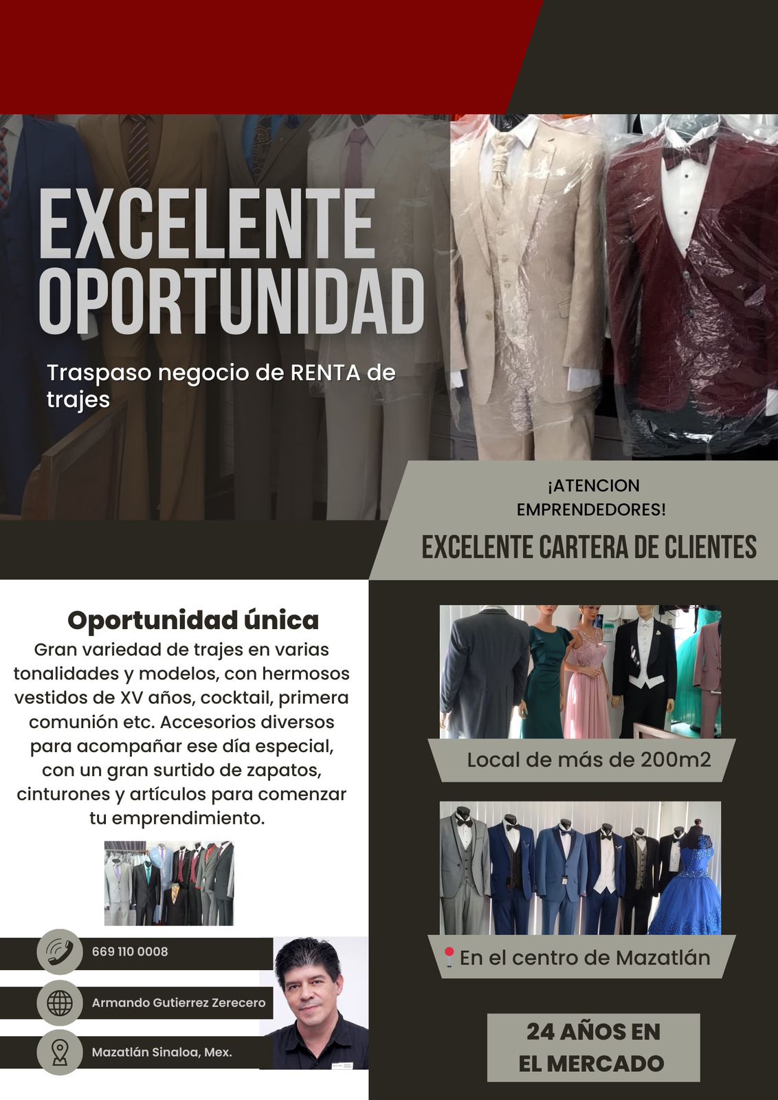 Gran oportunidad de venta de trajes, vestidos de cocktail, trajes, artÃculos y accesorios de noche para acompañar esa noche especial. Con un gran surtido de zapatos, cinturones y más opciones para comenzar tu emprendimiento.